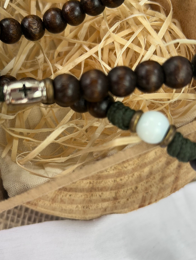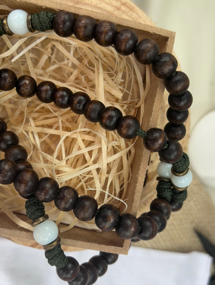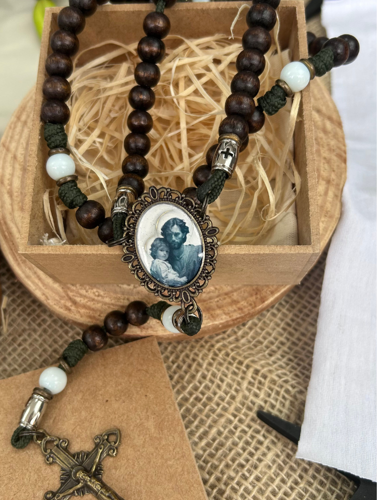 As contas em madeira representam o ofício de carpinteiro, símbolo do trabalho humilde e santificado.