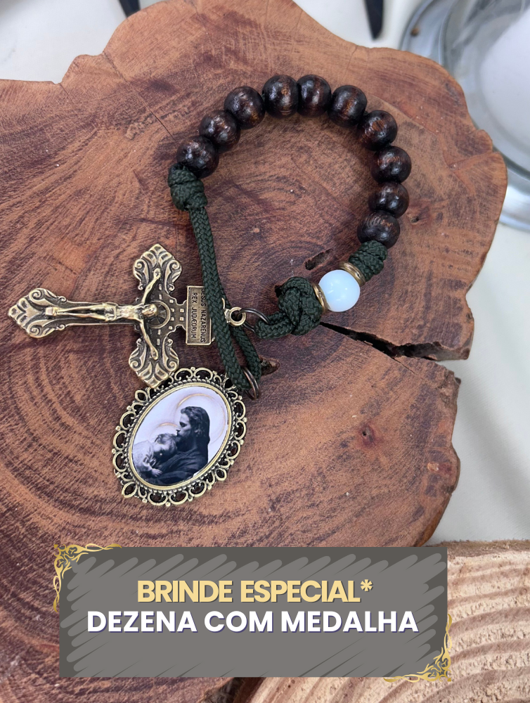 O kit acompanha também uma dezena especial — com o Crucifixo do Perdão e medalha exclusiva — e o Manto Sagrado de São José, devoção que invoca sua poderosa intercessão e proteção.