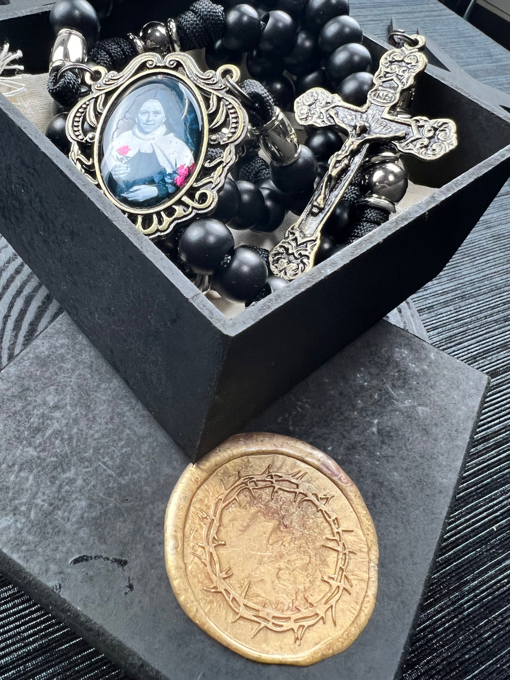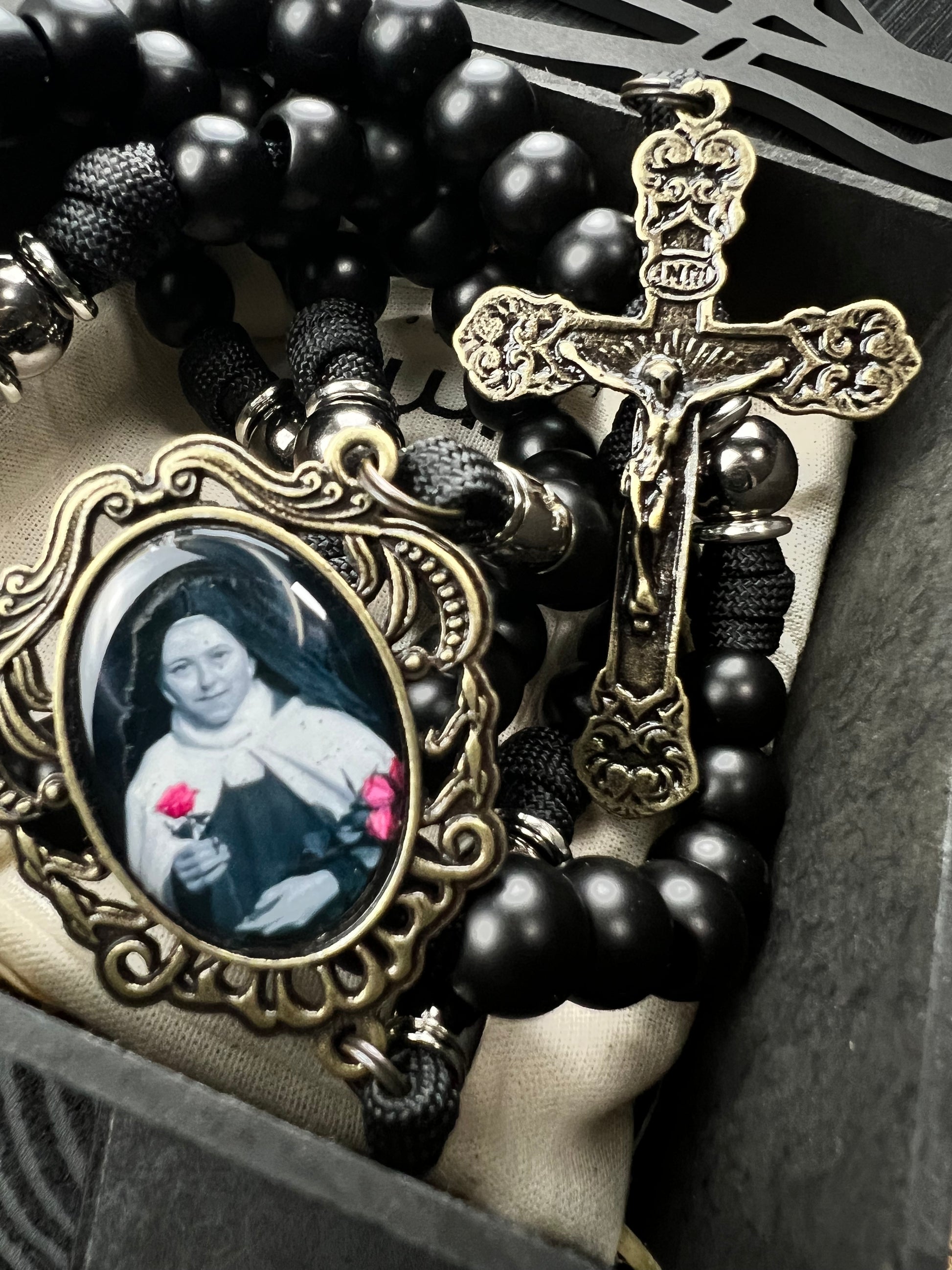 Na escuridão do Carmelo, Santa Teresinha floresceu. Sua “pequena via” ensinou que mesmo nas noites da alma, o amor pode ser radical. Este terço preto, com sua imagem em preto e branco, reflete a sobriedade e a profundidade da alma que se oferece como vítima de amor.